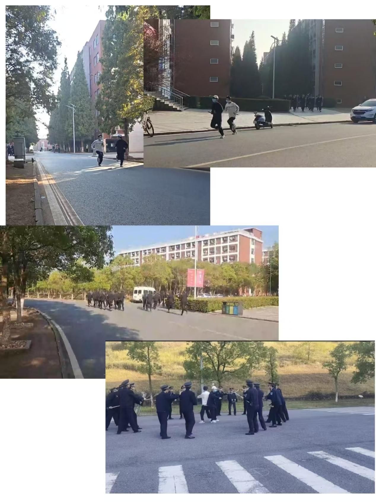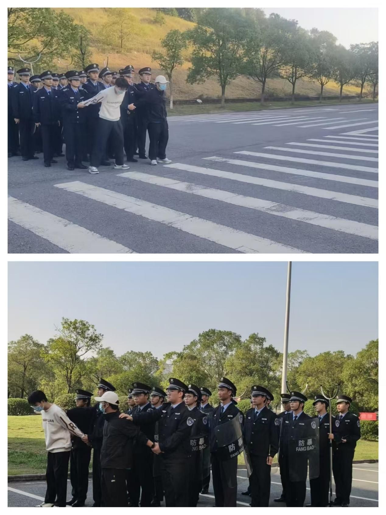 一组二组分别从两个方向包抄,截断匪徒所有可能逃跑的路线,经过在后山的一顿周旋两匪徒被团团围住,退无可退。最终匪徒被校卫队员制伏并由保安大叔用巡逻车带回校园110处,校卫队成员圆满完成任务并列队回办公室。