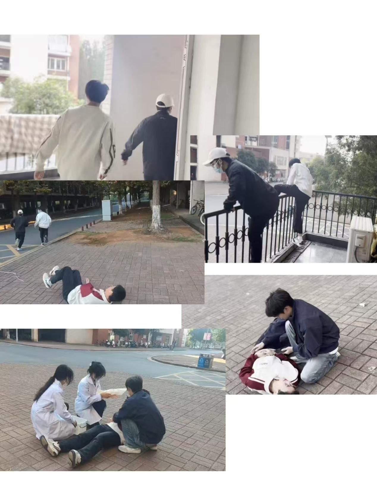 演练中,一个男生在宿舍楼遇见两个匪徒,一人拿刀恐吓,一人抢劫东西,匪徒得手后从二楼直接跳到一楼逃走,遇到路人阻拦,恐吓路人之后往学校后山逃窜。随后校卫队接到报警电话,得知情况后带好钢叉、警棍和护盾,由队长下达抓捕任务,迅速出动。