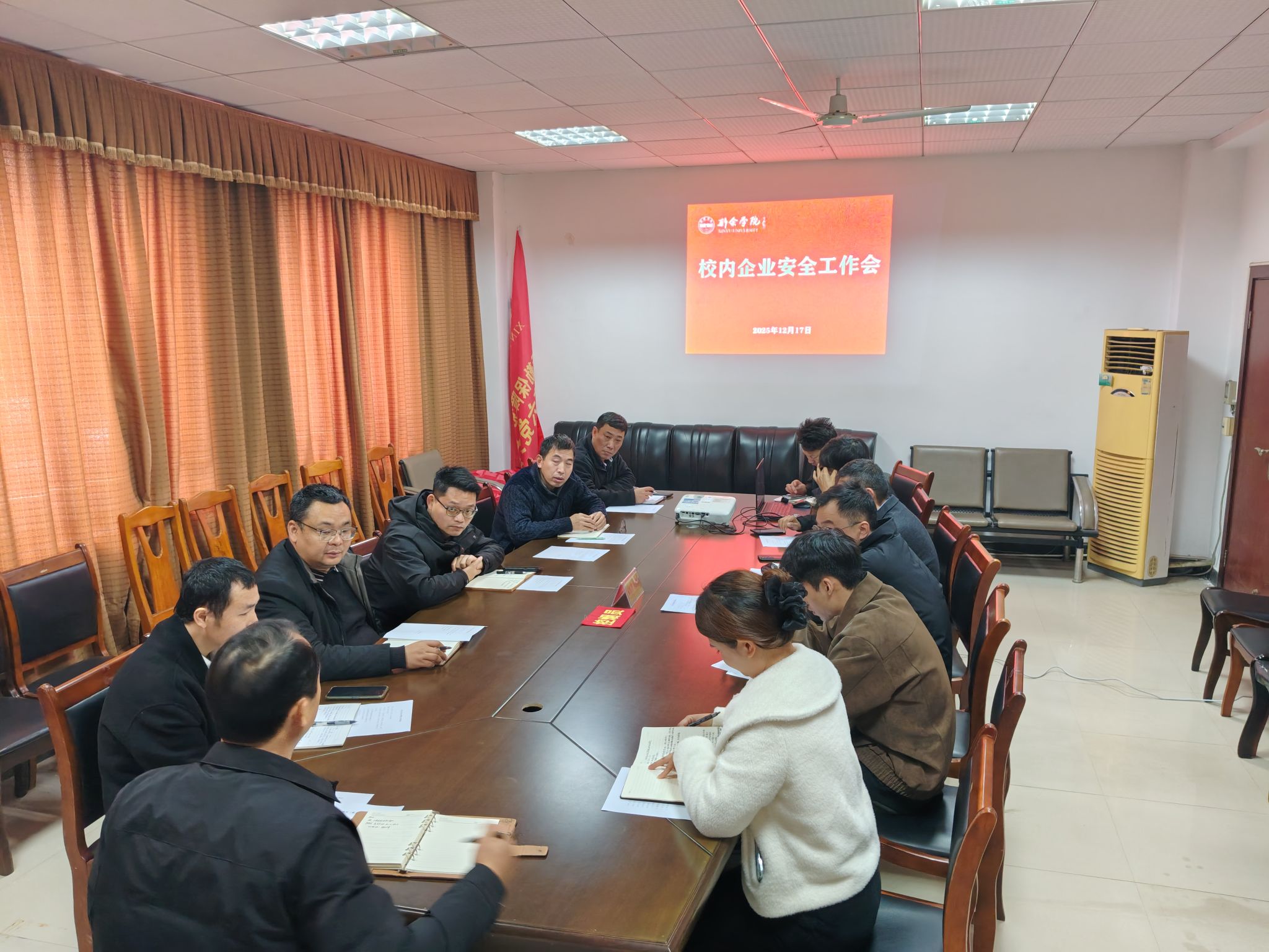 为进一步加强校园安全管理,压实企业安全主体责任,筑牢校园安全屏障,12月17日上午,校平安办在会议室组织召开了校内企业安全工作会。第一食堂、第二食堂、校园超市、物业公司、绿化公司、快递服务中心、外卖平台及美食城等校内各经营服务单位负责人参加了会议。会议由保卫处负责同志主持。