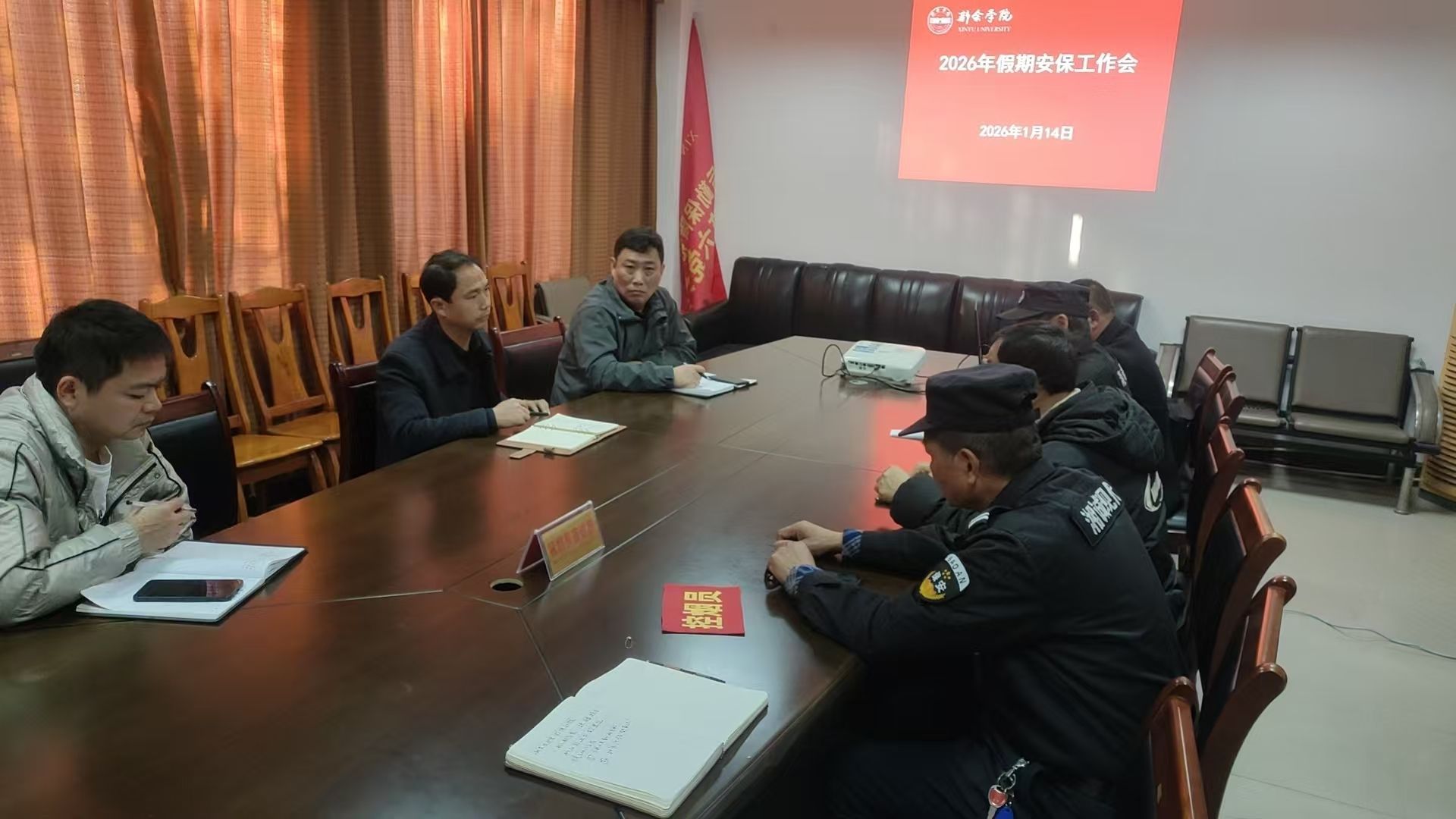 为确保寒假期间校园安全稳定,1月14日,保卫处组织召开安全保卫工作会议,全面研判安全形势,部署假期各项安保任务。保卫处负责人主持会议,治安科、物业公司相关人员参加了会议。