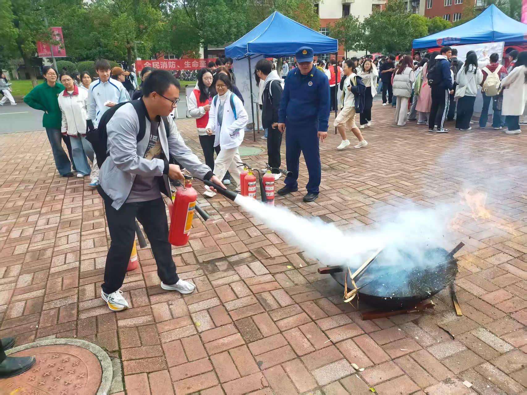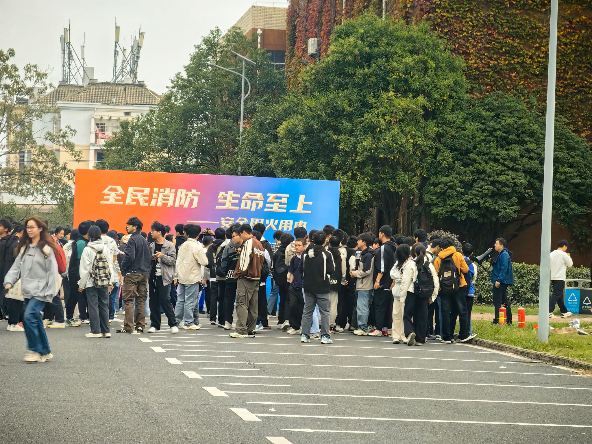 为增强师生消防安全意识,提升应急避险和自救互救能力,11月11日,校保卫处联合校团委及高新区消防救援大队组织开展了119消防宣传日活动及消防疏散逃生演练等活动,活动通过“理论讲解+实战演练”相结合的方式,实战演练以学院轮训的方式展开,确保新生全覆盖参与,当天参加轮训的是机电学院、建设学院和新能源学院2025级学生。