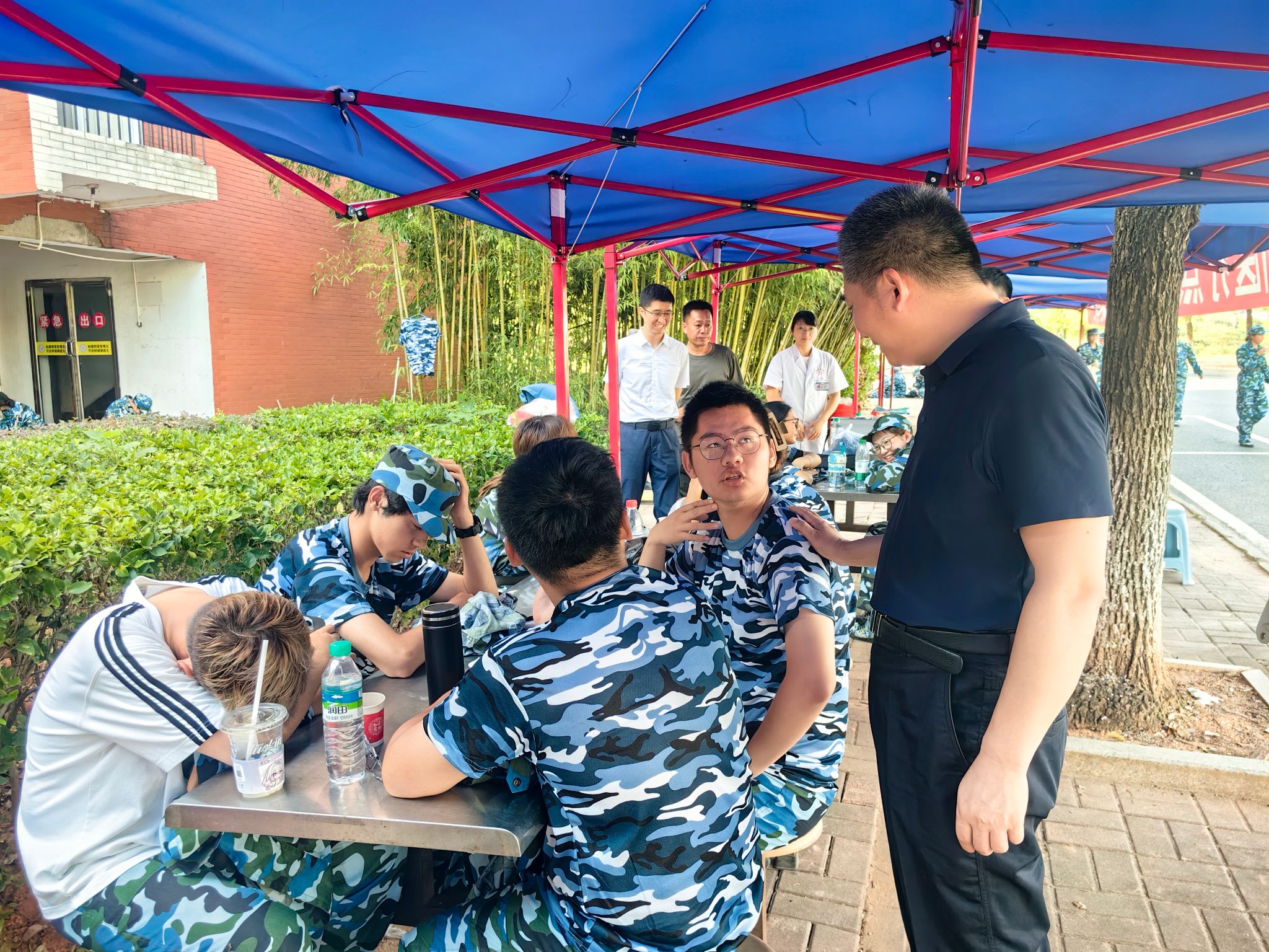 伍复康来到军训医疗点,嘱咐医务人员密切关注学生的身体和心理状态,做好防暑降温工作,为全体参训师生提供坚实可靠的健康保障。